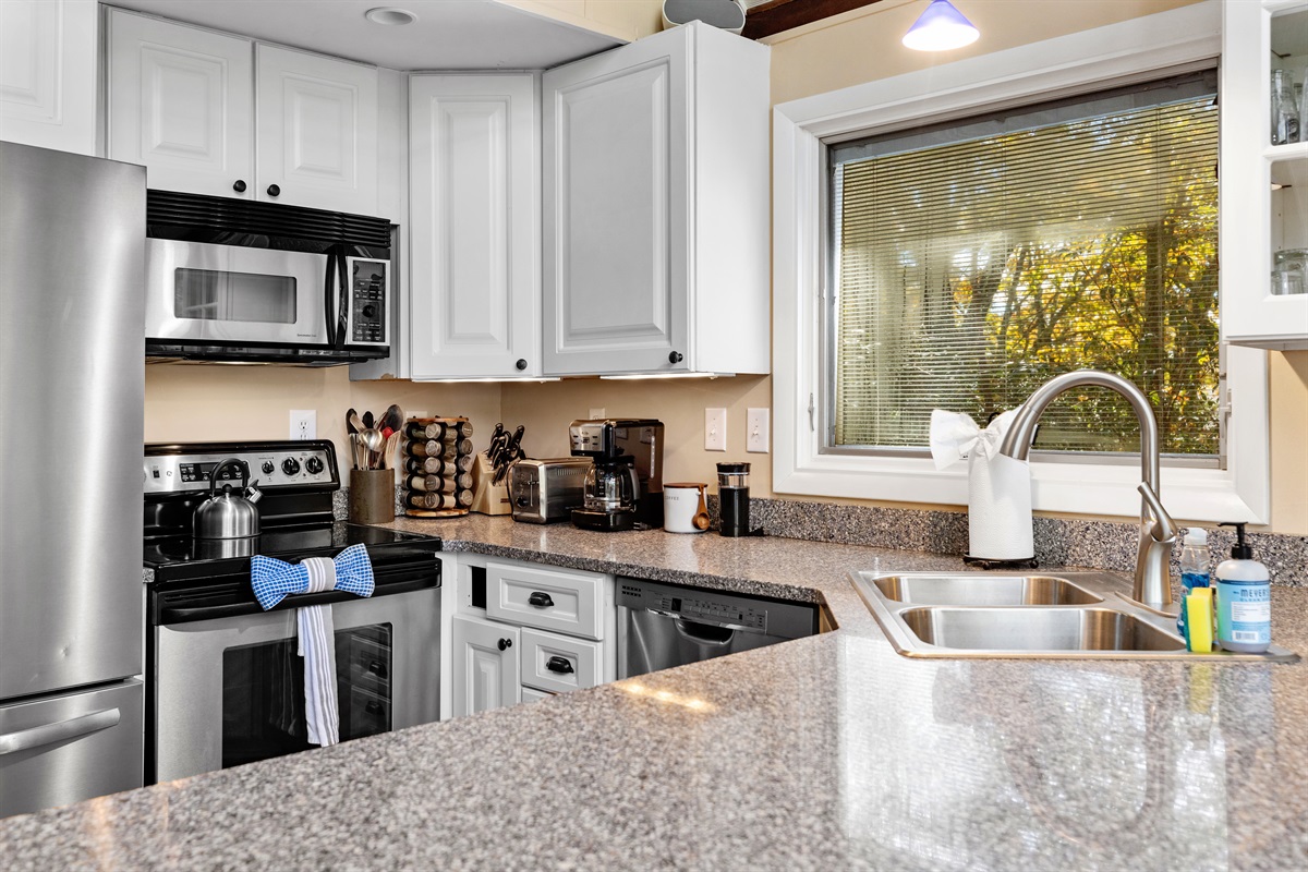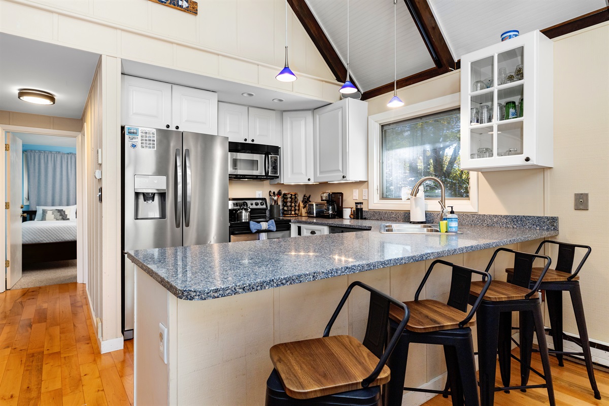 KITCHEN: Fully equipped w/ breakfast bar, stainless steel appliances, drip coffee maker, toaster, knife set
