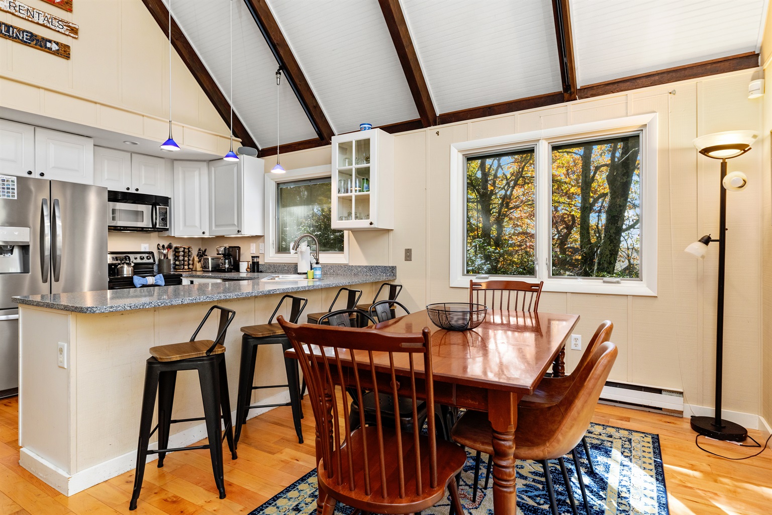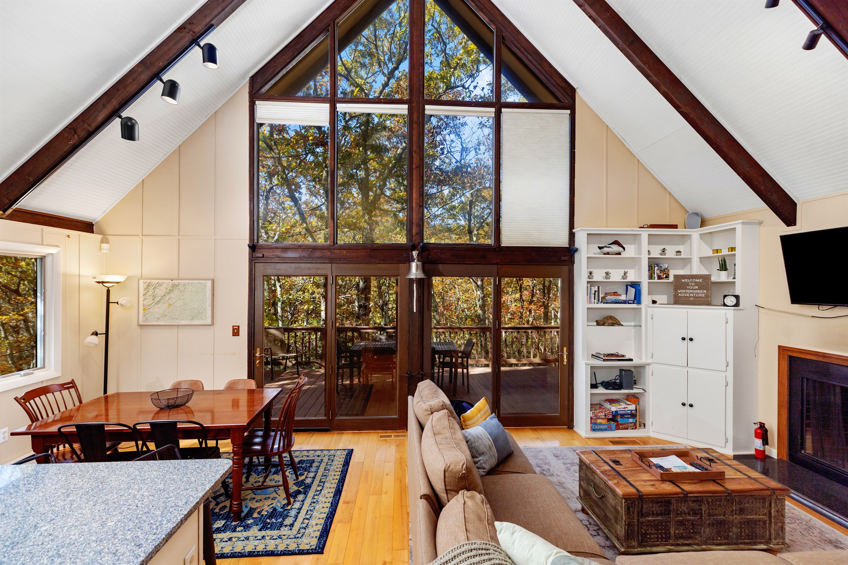 INDOOR LIVING: Open-concept living area, gas fireplace, vaulted ceilings, family-style dining table, floor-to-ceiling windows, flat-screen TV